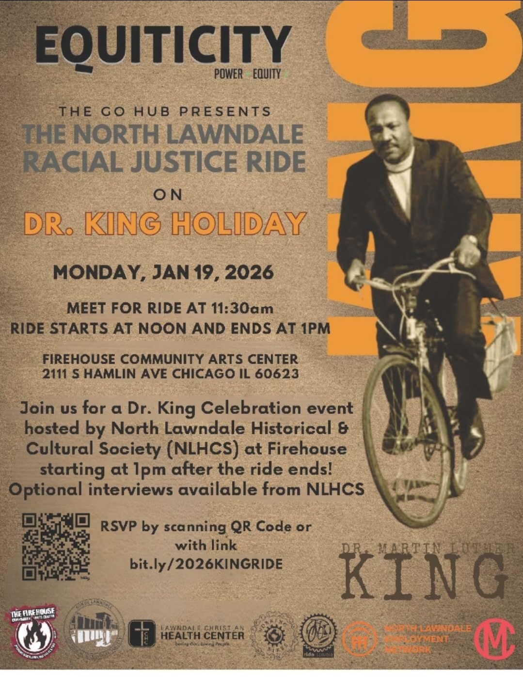 Join us for a Dr. King celebration event hosted by North Lawndale Historical and Cultural Society at the Firehouse, 2111 N. Hamlin Ave starting at 1:00 p.m. after the ride ends! Bike ride starts at 12pm to tour historical North Lawndale.