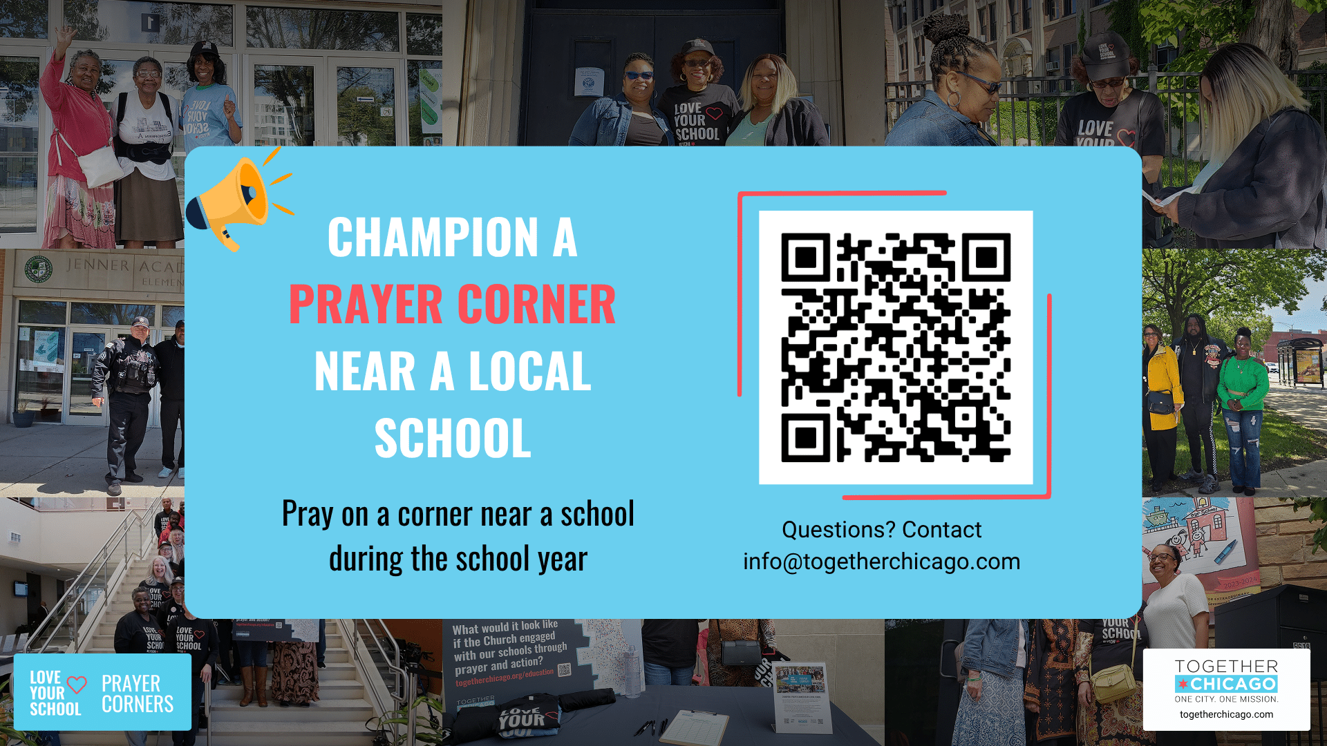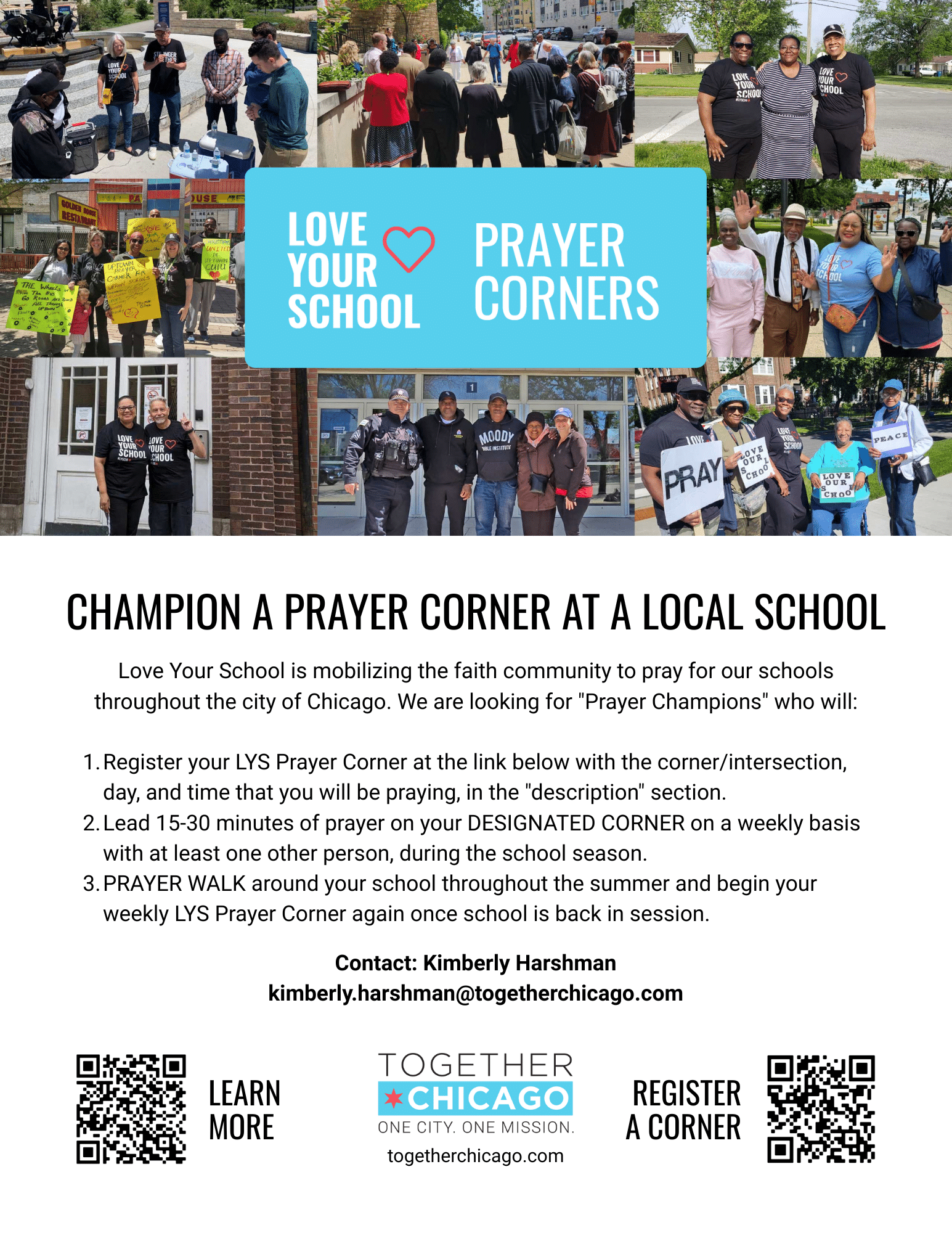 Love Your School Prayer Corners is a prayer movement mobilizing the faith community into the place of prayer for our schools throughout the city of Chicago. We are looking for Prayer Champions who will lead 15-30 minutes of prayer on their DESIGNATED CORNER on a weekly basis during the school year. Each Prayer Champion chooses the day and time that works best for them. Love Your School Prayer Corners is not an event. It is taking a stance to stand in the gap for our youth, teachers and faculty.